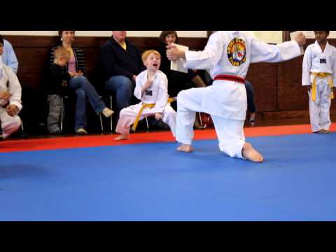 So, Thursday was a big day for me as I tested for my new belt at Tae Kwon Do. I was ready for it having practiced my Korean terms, new kick with board breaking and most of all the forms(choreographed steps). Here are some videos mom took at the testing ceremony.